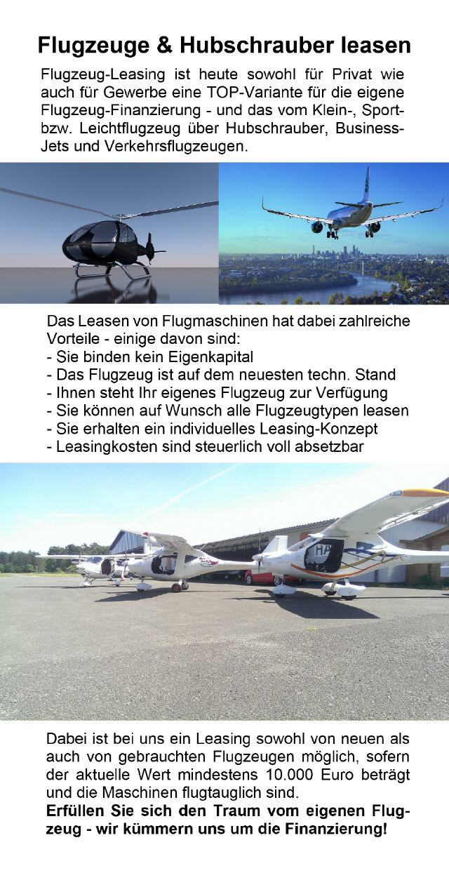 Flugzeug-Leasing ist heute sowohl für Privat wie auch für Gewerbe eine TOP-Variante für die eigene Flugzeug-Finanzierung - und das vom Klein-, Sport- bzw. Leichtflugzeug über Hubschrauber, Business-Jets und Verkehrsflugzeugen. Das Leasen von Flugmaschinen hat dabei zahlreiche Vorteile!